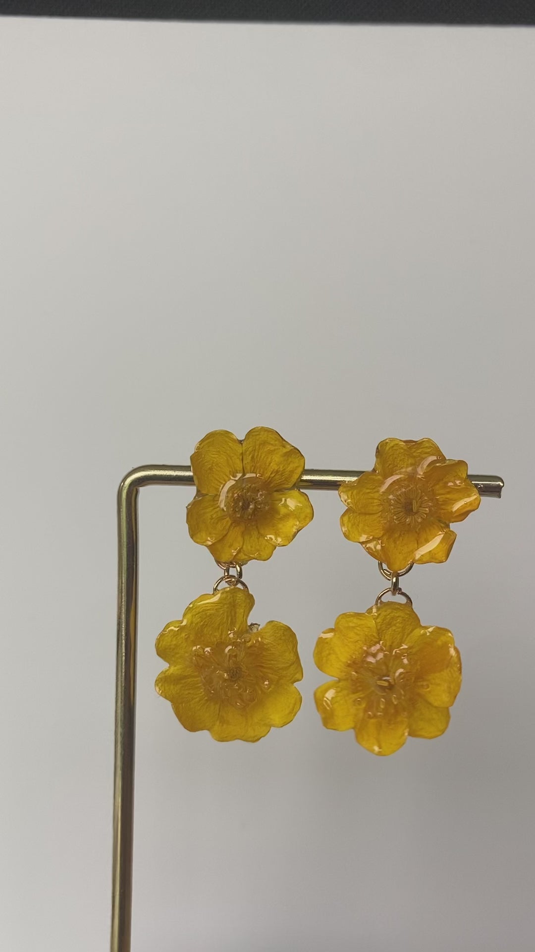 Boucles d'oreilles réalisées avec de véritables boutons d'or. Chaque fleur est cueillie, séchée, cristallisée, puis assemblée avec des pièces en