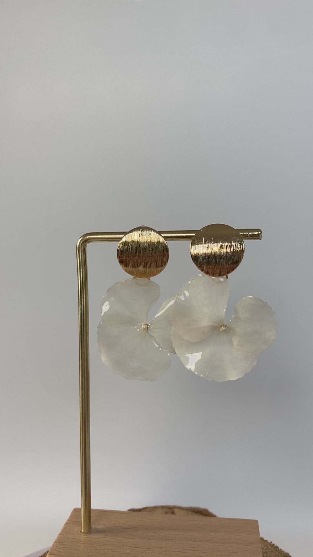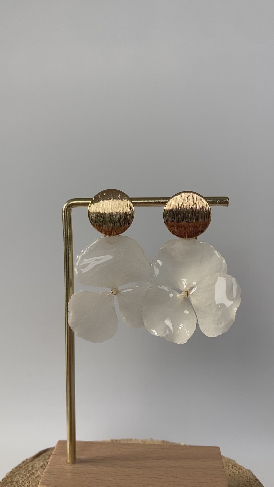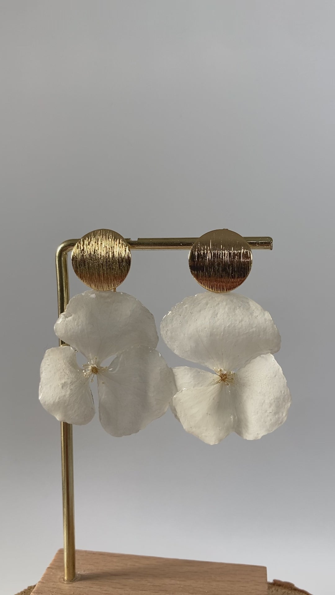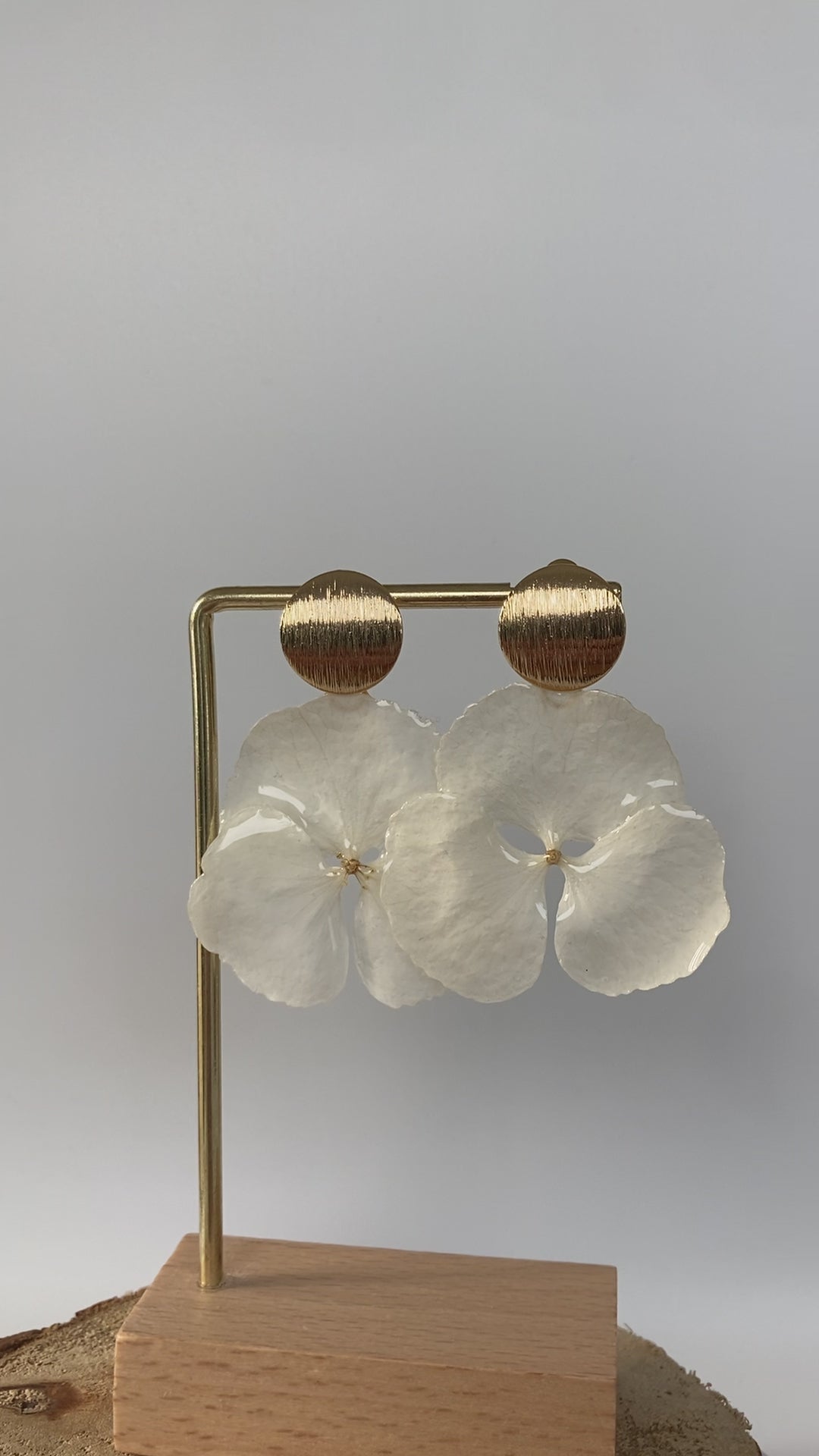 Boucles d'oreilles réalisées avec de véritables hortensias. Chaque fleur est cueillie, séchée, cristallisée, puis assemblée avec des pièces en