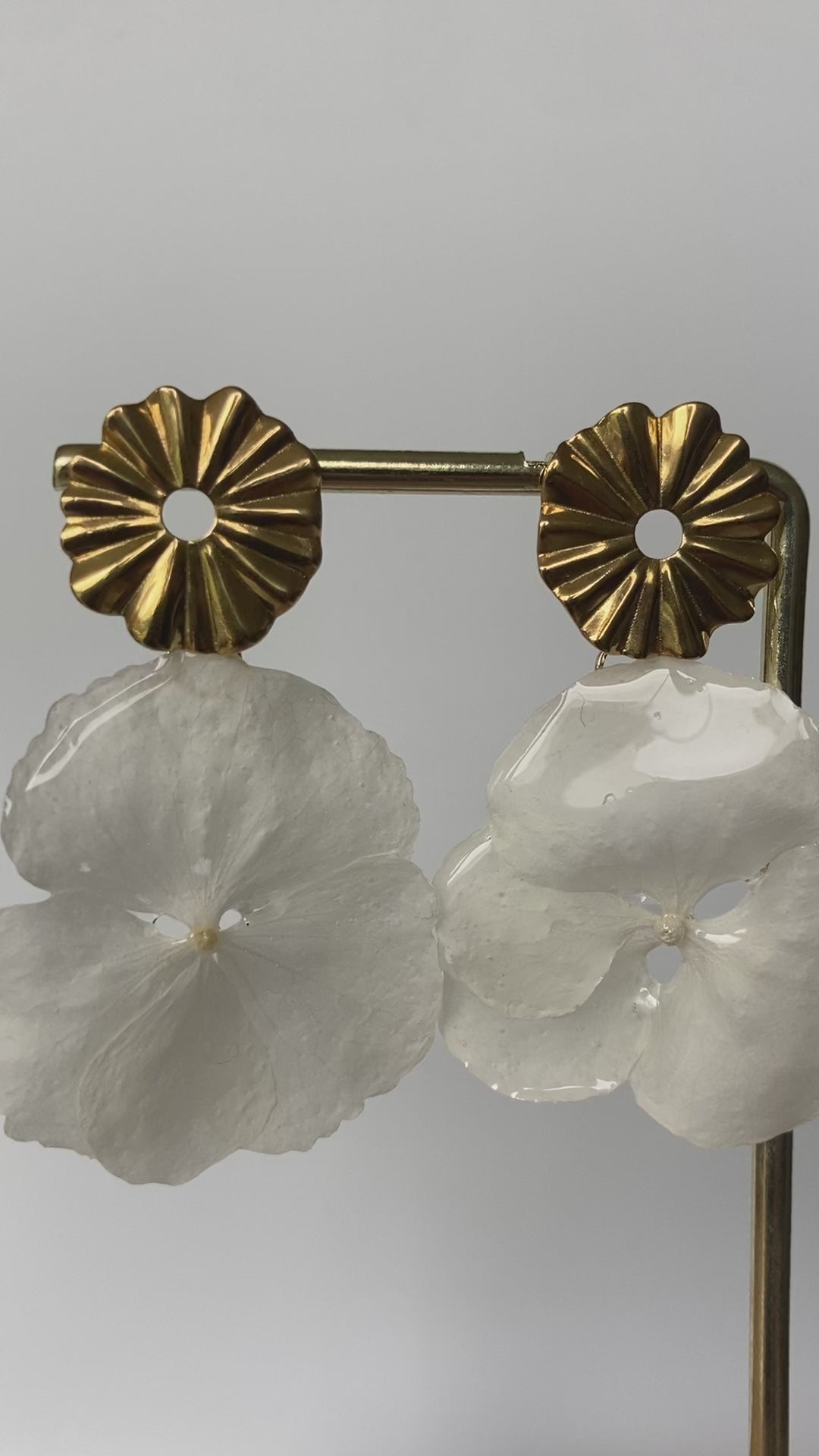 Boucles d'oreilles réalisées avec de véritables hortensias. Chaque fleur est cueillie, séchée, cristallisée, puis assemblée avec des pièces en