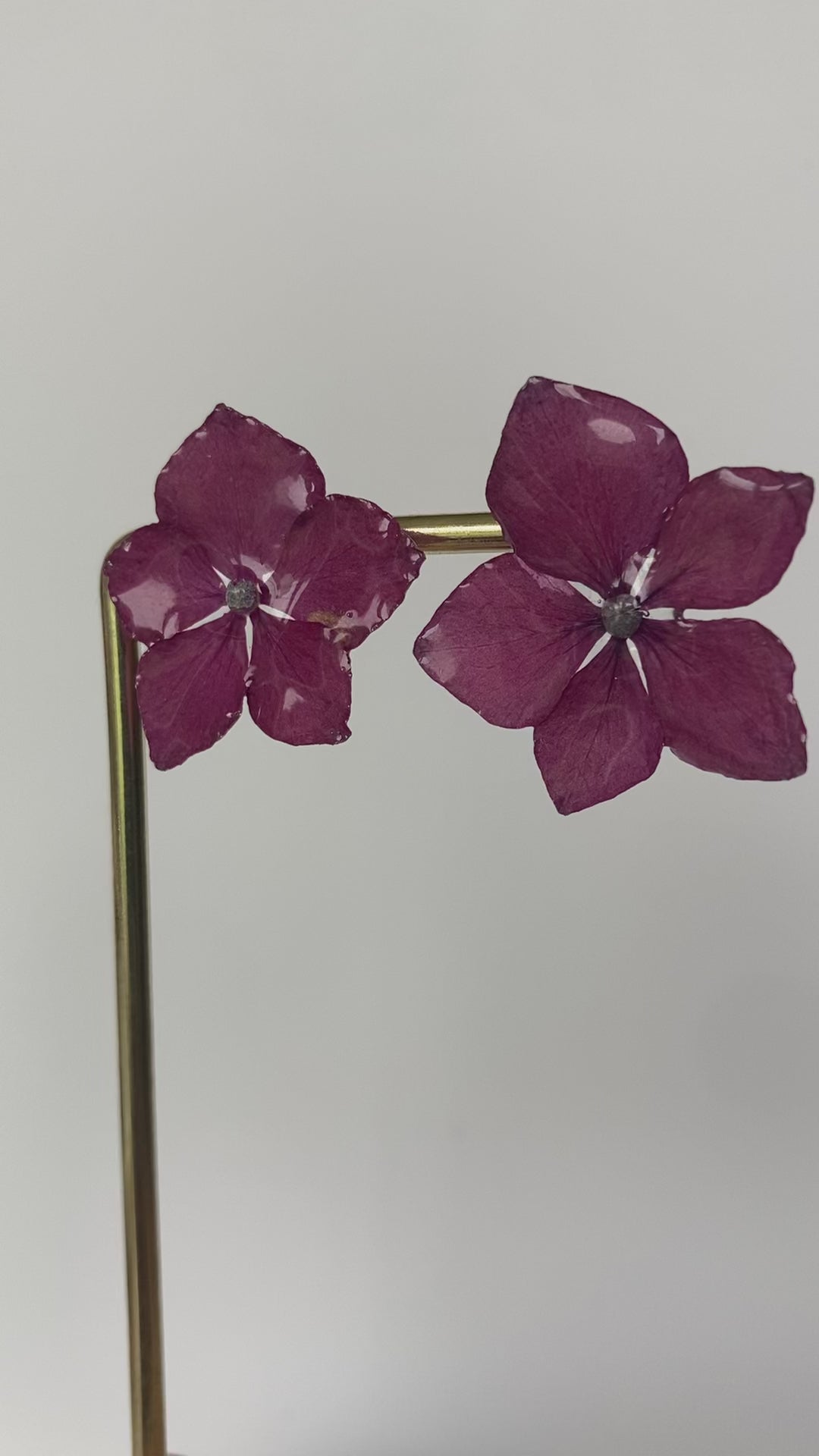 Boucles d'oreilles réalisées avec de véritables hortensias. Chaque fleur est cueillie, séchée, cristallisée, puis assemblée avec des pièces en