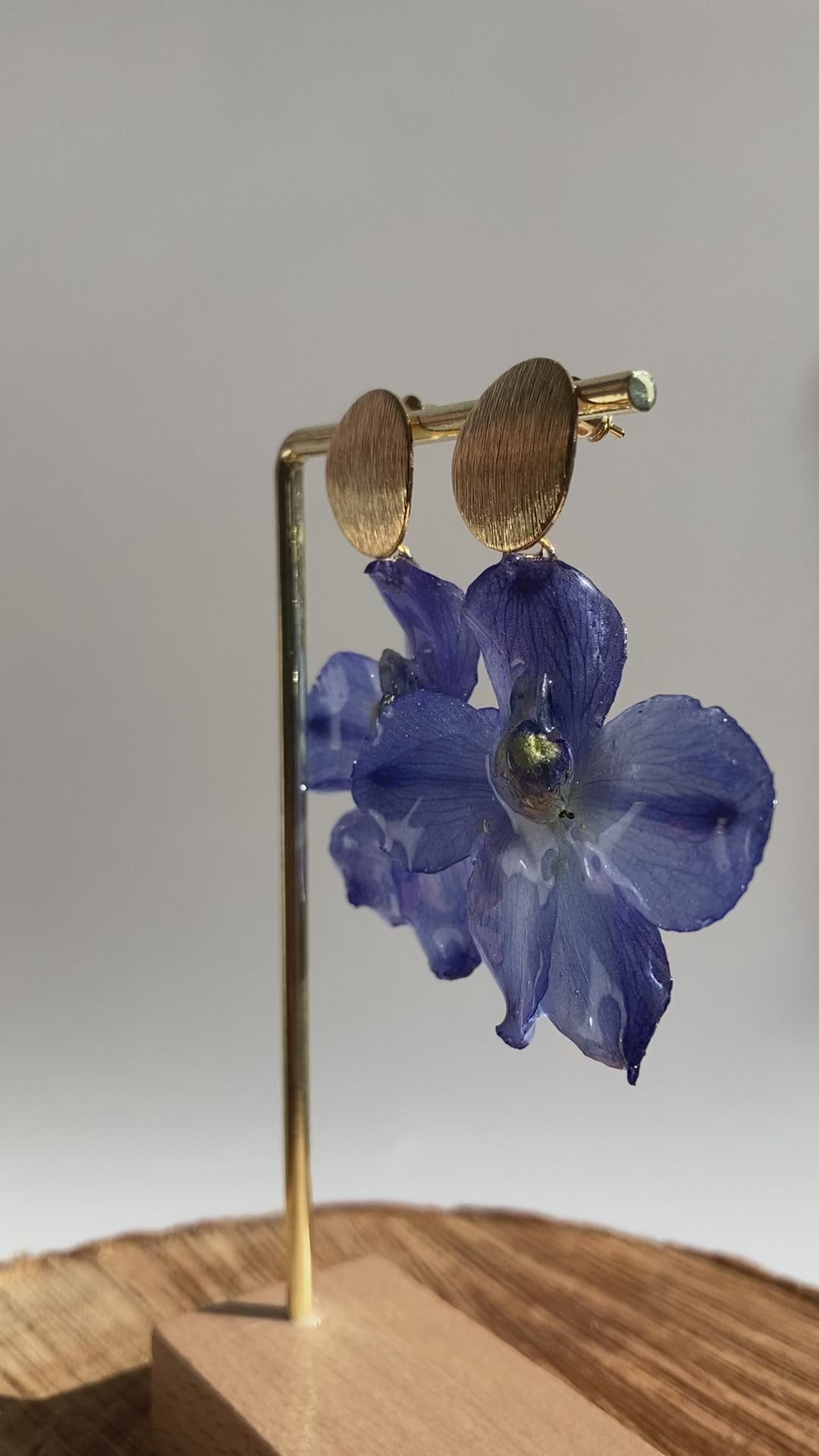 Boucles d'oreilles réalisées avec de véritables delphinium. Chaque fleur est cueillie, séchée, cristallisée, puis assemblée avec des pièces en
