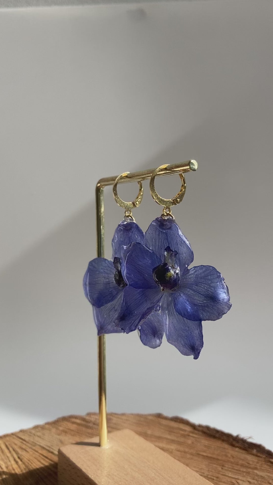 Boucles d'oreilles réalisées avec de véritables delphinium. Chaque fleur est cueillie, séchée, cristallisée, puis assemblée avec des pièces en
