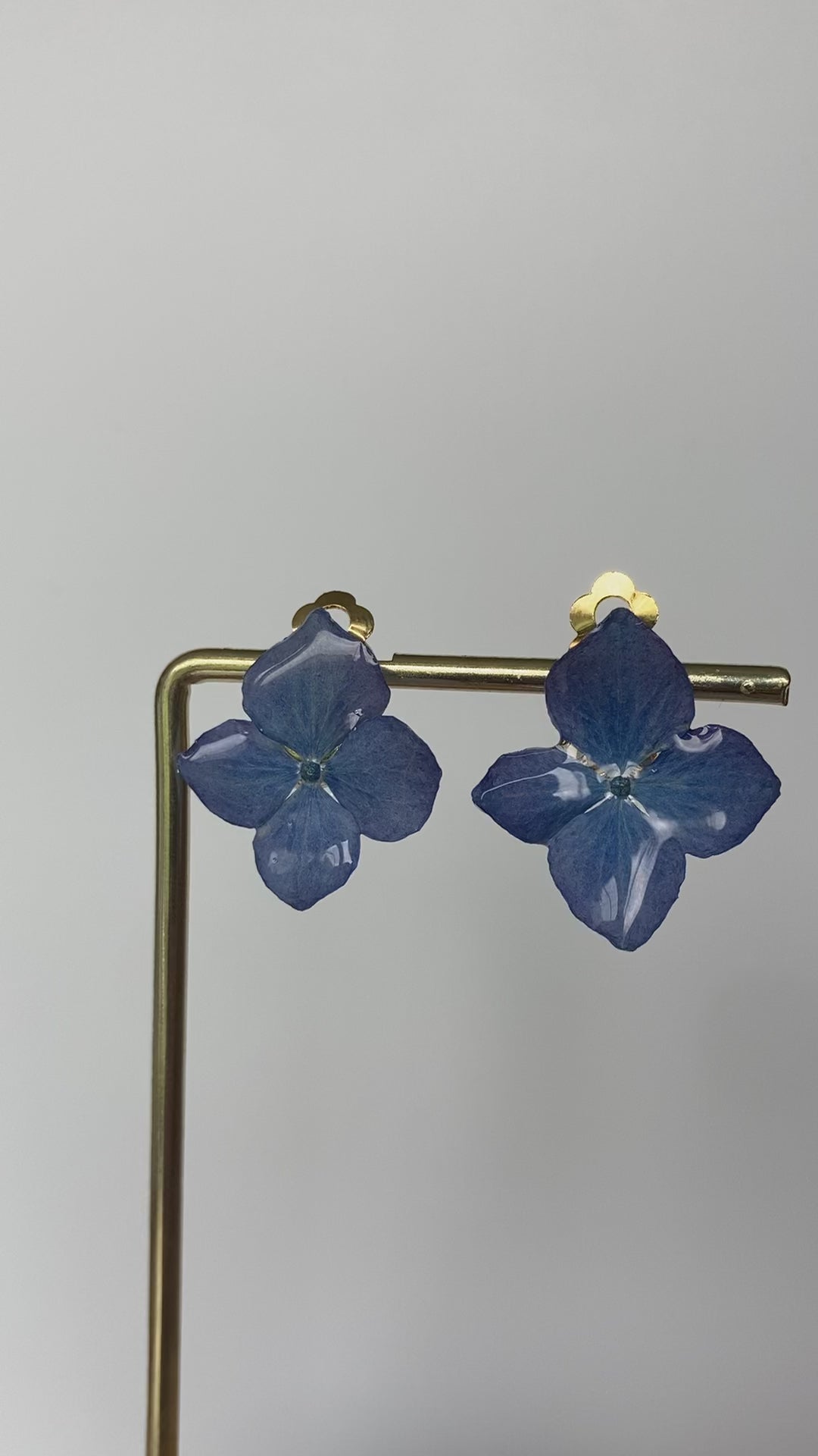 Boucles d'oreilles réalisées avec de véritables hortensias. Chaque fleur est cueillie, séchée, cristallisée, puis assemblée avec des pièces en