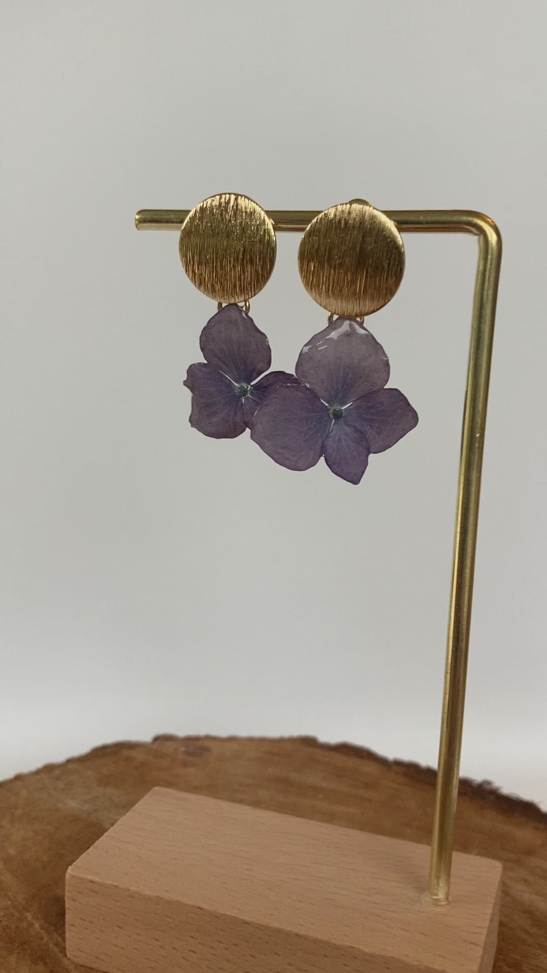 Boucles d'oreilles réalisées avec de véritables hortensias. Chaque fleur est cueillie, séchée, cristallisée, puis assemblée avec des pièces en
