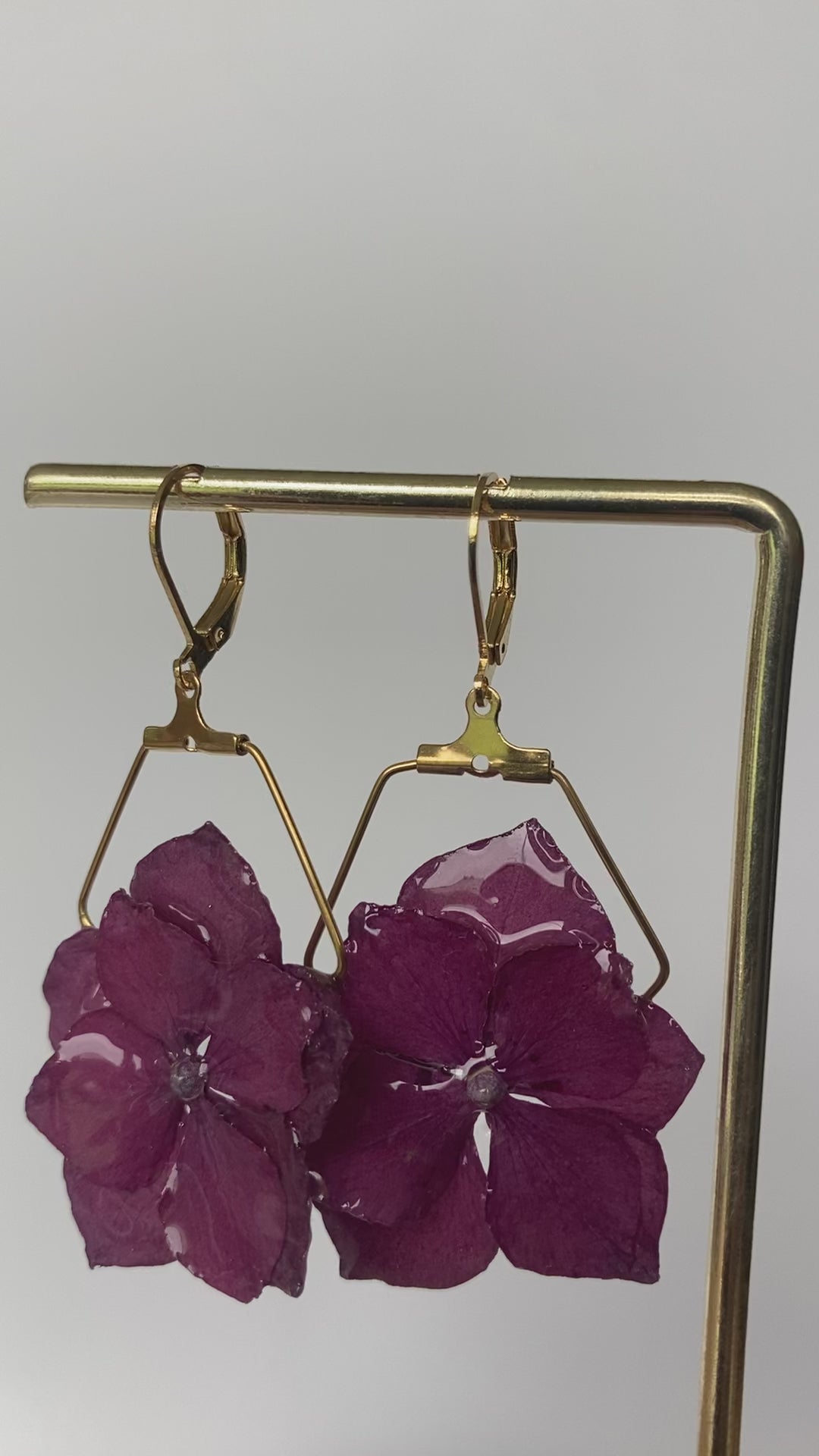 Boucles d'oreilles réalisées avec de véritables hortensias. Chaque fleur est cueillie, séchée, cristallisée, puis assemblée avec des pièces en