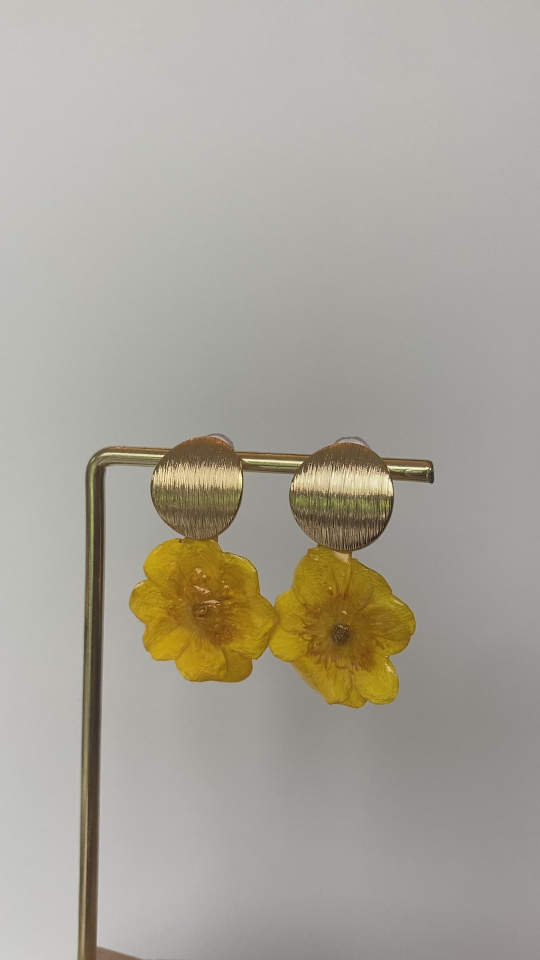 Boucles d'oreilles réalisées avec de véritables boutons d'or. Chaque fleur est cueillie, séchée, cristallisée, puis assemblée avec des pièces en