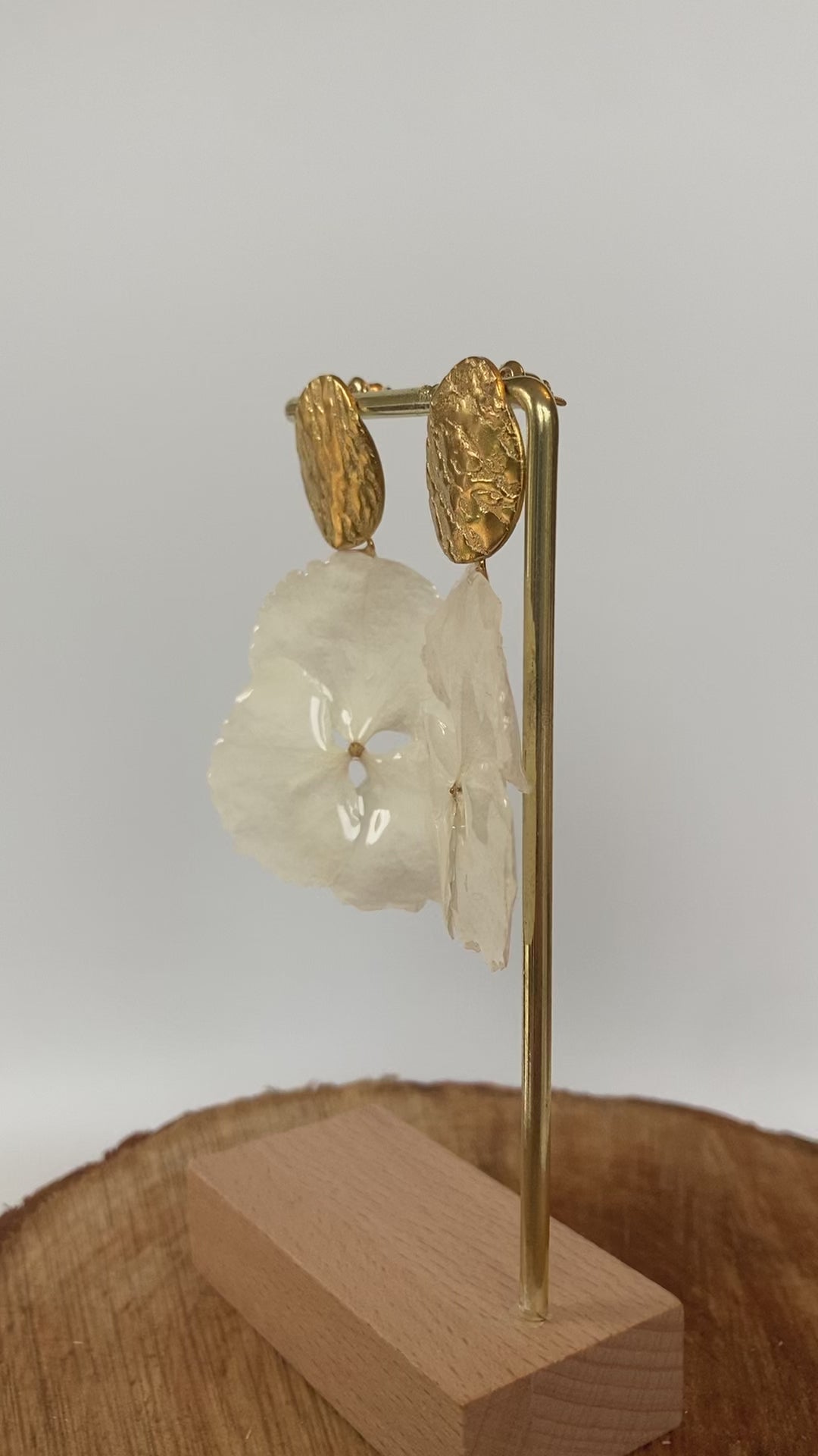 Boucles d'oreilles réalisées avec de véritables hortensias. Chaque fleur est cueillie, séchée, cristallisée, puis assemblée avec des pièces en
