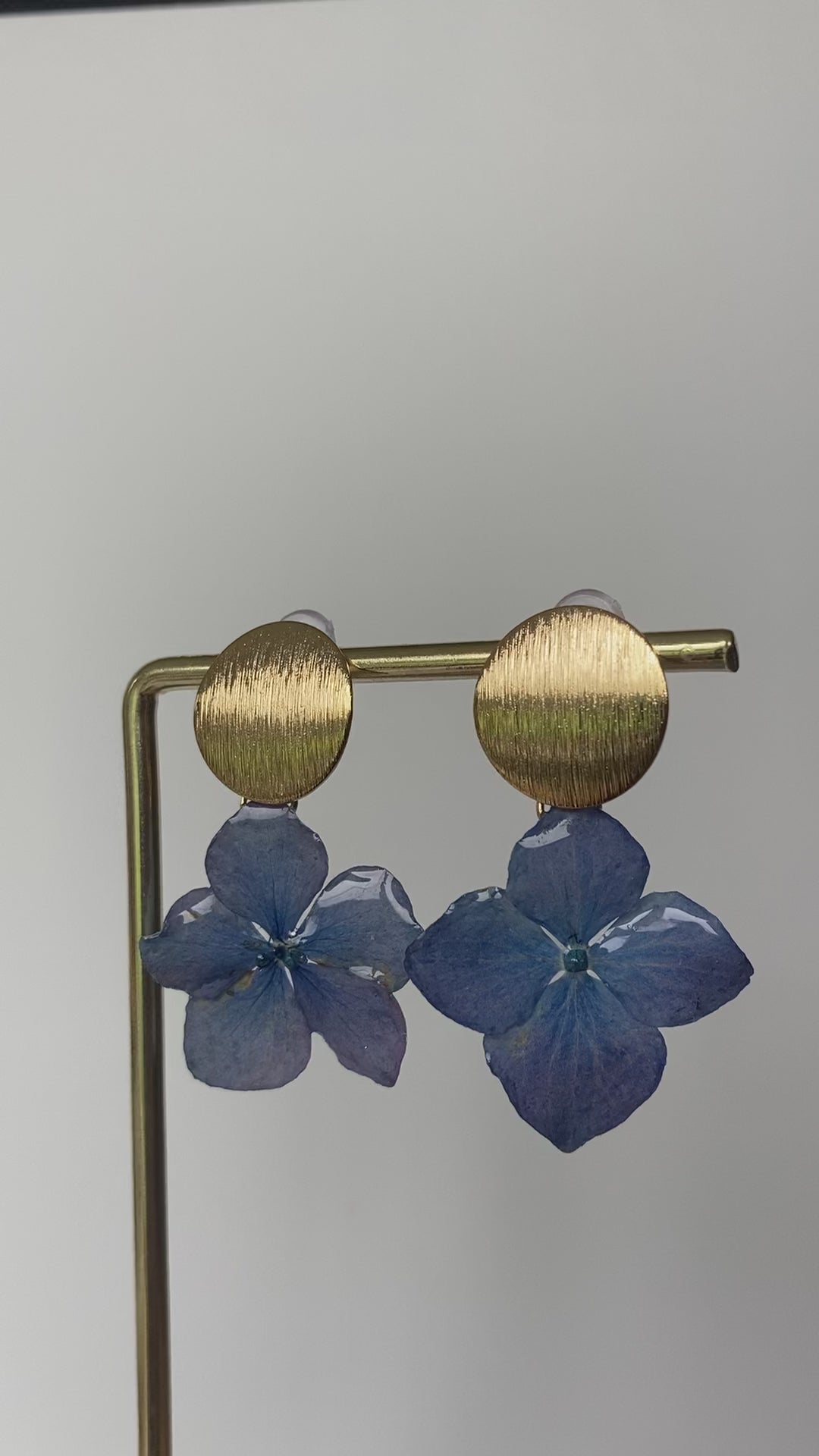 Boucles d'oreilles réalisées avec de véritables hortensias. Chaque fleur est cueillie, séchée, cristallisée, puis assemblée avec des pièces en