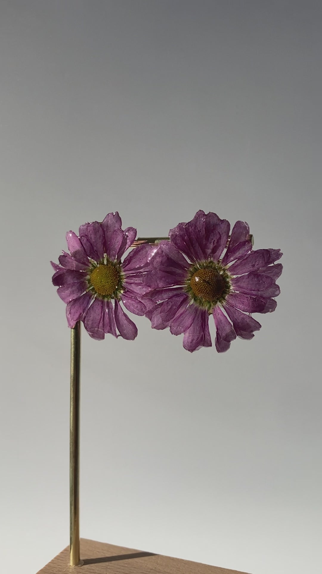 Boucles d'oreilles réalisées avec de véritables Santini. Chaque fleur est cueillie, séchée, cristallisée, puis assemblée avec des pièces en